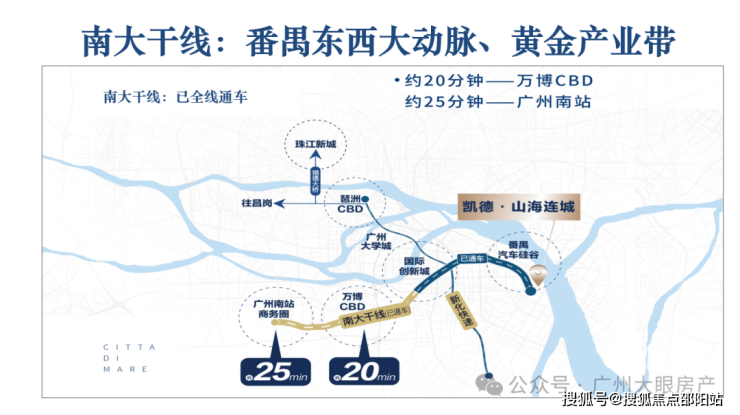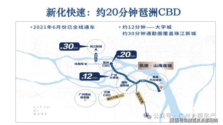 好处是项目自驾还算方便,目前南大干线已经全线开通,去往南站、万博、大学城、创新湾等地都很快,比如去往琶洲,仅仅26分钟的车程时间