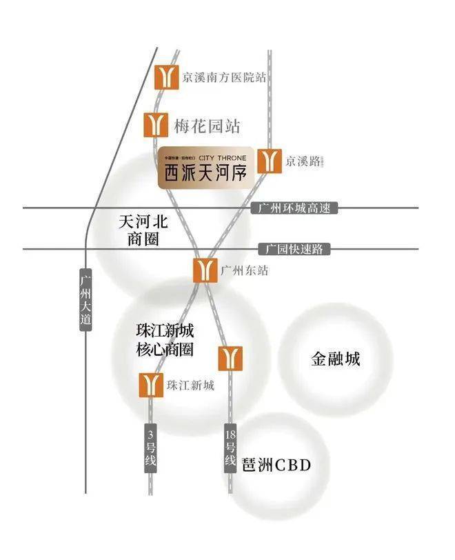 这条中轴线上,一代地标中信广场(高约 391m)、二代地标广州塔(高约 600m),以及三代地标东塔(高约 530m)、西塔(高约 440.75m)鼎立,构筑起震撼人心的城市封面天际线,彰显着广州的城市高度与繁荣;广州大剧院、广州图书馆、广东省博物馆等人文场馆荟萃,塑造出城市文化客厅,承载着深厚的文化底蕴;作为华南总部经济、金融、科技、商务集聚地,全国首个约万亿商圈天河路商圈以全广州约 1/600 面积贡献 1/8GDP,扛鼎城市繁华命脉。西派天河序传承西派系高端基因,建筑风格独特,与中轴地标交相辉映。居住于此,业主既能深度参与中轴线上的高端商务活动,感受城市的蓬勃经济活力,又能便捷享受文化、商业带来的丰富生活,在城市主轴之上,体验繁华与文化交织的瑰丽生活,彰显非凡身份与地位。