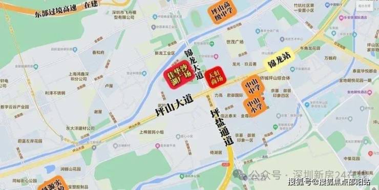 佳华沙湖广场项目位于坪山区坪山大道与锦龙大道交汇处西北角(14号线地铁锦龙站旁),项目是包含商业、办公/公寓、住宅、幼儿园于一体的大型综合体,总建面超62万㎡。隔壁是深业国际东城、力高君御国际等住宅区。