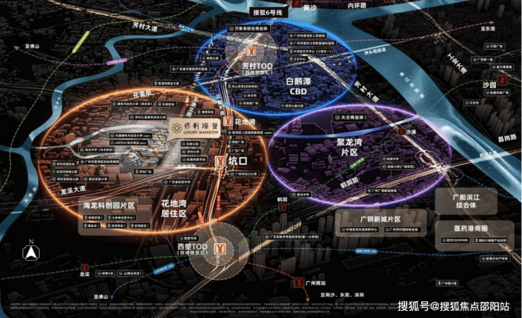 ◎ 花地湾居住区:大力推动产业科技互促双强,聚焦“广佛极点”科创中心功能定位。板块同步开发建设生活大城,承接产、商人群居住需求。