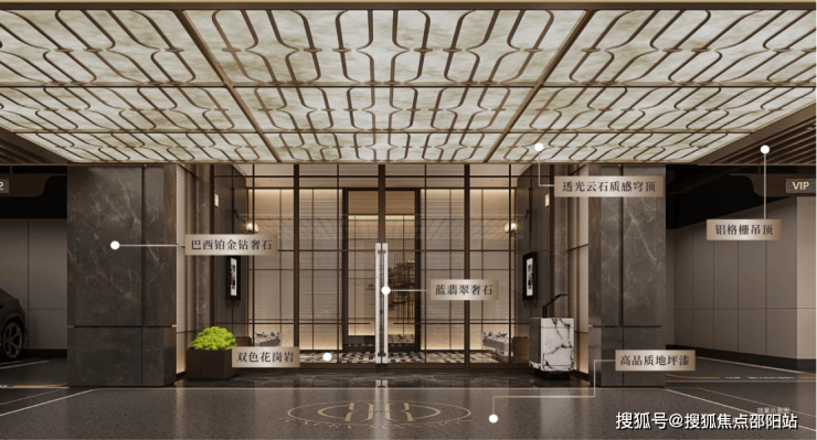 车库内部打造透光云石质感穹顶、铝格栅吊顶、仿石漆天花、高品质地坪漆、蓝翡翠奢石(局部)等豪奢配置。穿越奢华的归家路,际遇层峯的尊崇归家礼序。