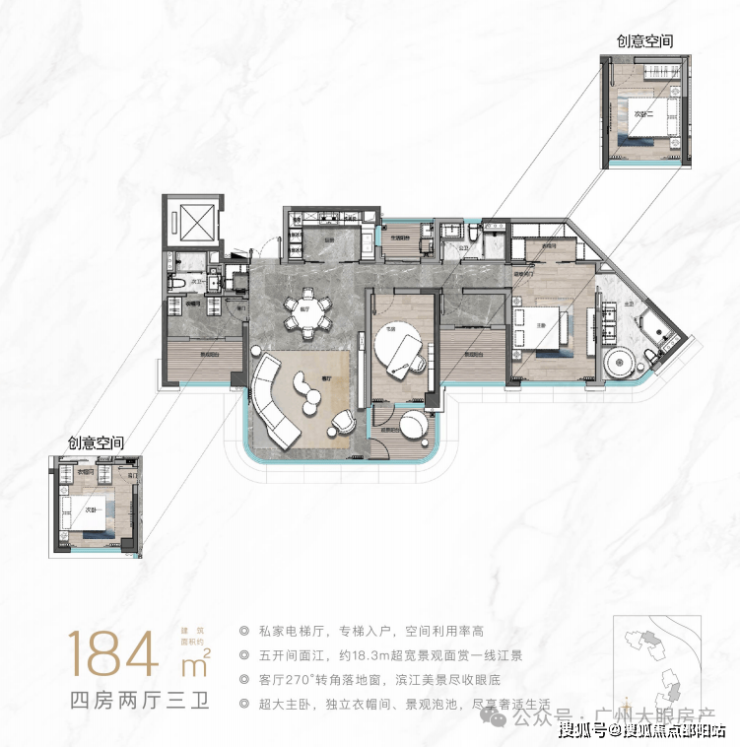 目前楼王产品璇湾壹号面积段为184-255㎡的4至5房,瞰江面最高18.3米,最高270°观景面,临江约100米,户型图如下:
