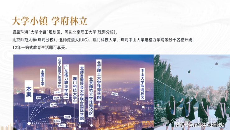 澳门科技大学、格力职业学院、北京师范大学、北京理工大学、北师大附属外国语学校、北师港浸大UIC等学府环绕,珠海中山大学15分钟享12年教育资源。
