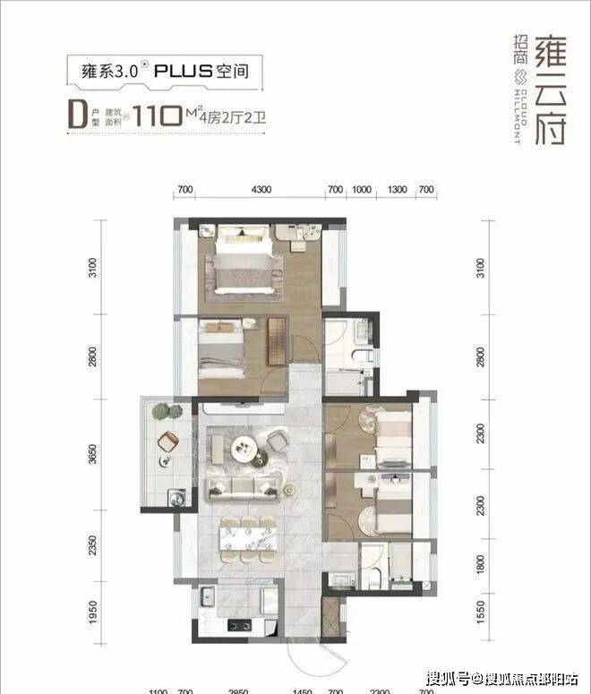 110㎡的4房2厅2卫,设计的是横厅南北通透格局,客餐厅一体化6米开间,4个卧室分别是3.1/2.8/2.3/2.3米的宽度,L型厨房,公卫三段式分离设计,得房率:78.7%(不含赠送),阳台主朝西南向。