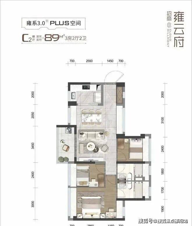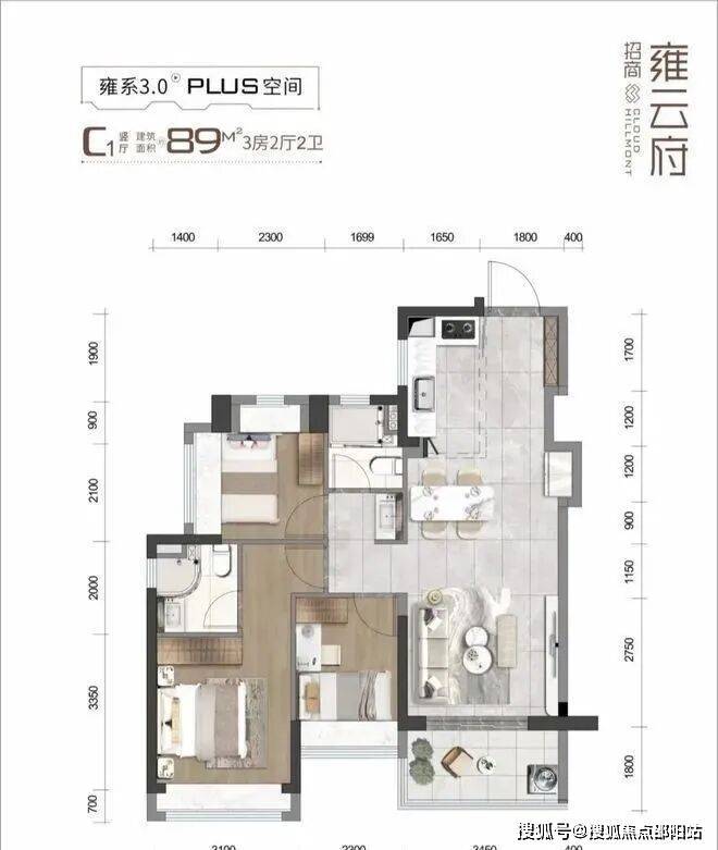 89㎡的3房2厅2卫(C1户型),设计的是经典竖厅格局,客餐厅一体化,客厅3.45米开间,S墙设计预留冰箱位,3个卧室分别是3.1/2.3/2.3米的宽度,L型厨房,公卫三段式分离设计,西南或东南朝向。