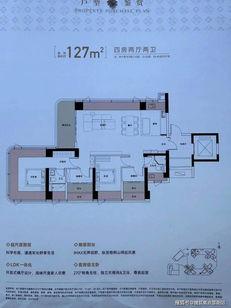 将地标高度/创新设计/极致景观/自然融合四大要素集于一体,约150米地标建筑以45°错位转体设计,实现四户分踞四角的独立瞰景布局,每户均可享有极致山海景观。约55米超宽楼间距、0.6的黄金窗墙比远超常规住宅0.3-0.5的标准,呈现山景、海景、花园三重景观界面。