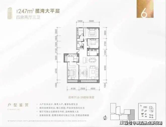 6栋望江公寓,总高43层,15、30楼是避难层,24年6月交,中区(16~29层:206、232、261㎡,5梯4户);低区(3~14层:98、146、143、151、161 ㎡,3梯7户,在售10、11楼)