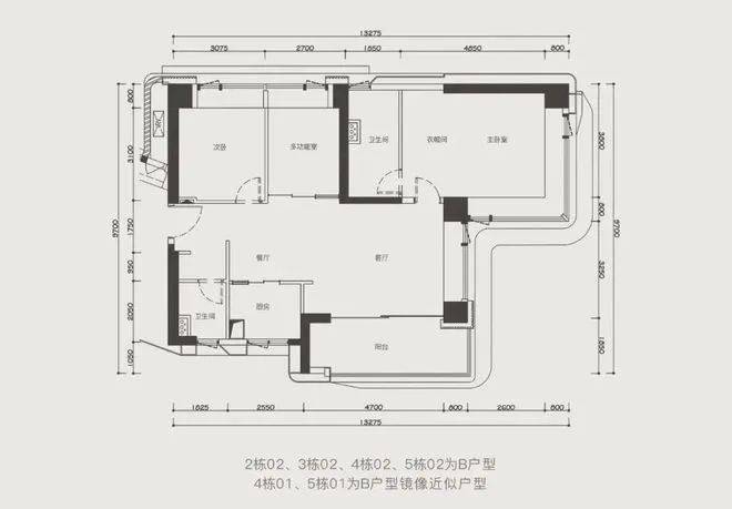 2/3栋02户型、4/5栋01、02户型:124-127平 3房