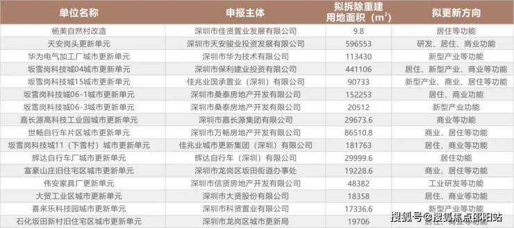 扬马片区城市更新单元拆除范围用地面积约14万㎡,拟更新方向为居住、商业等功能,目前更新单元计划草案已公示。杨美自然村城市更新单元占地面积约9.3万㎡,根据法定图则显示更新方向是产业为主另有少量商品房和公园绿地,目前更新单元旧屋村范围草案已公示。杨美社区上段片区城市更新单元拟拆除范围用地面积100077㎡,拟更新方向为居住、商业等功能,目前更新单元计划草案已公示。