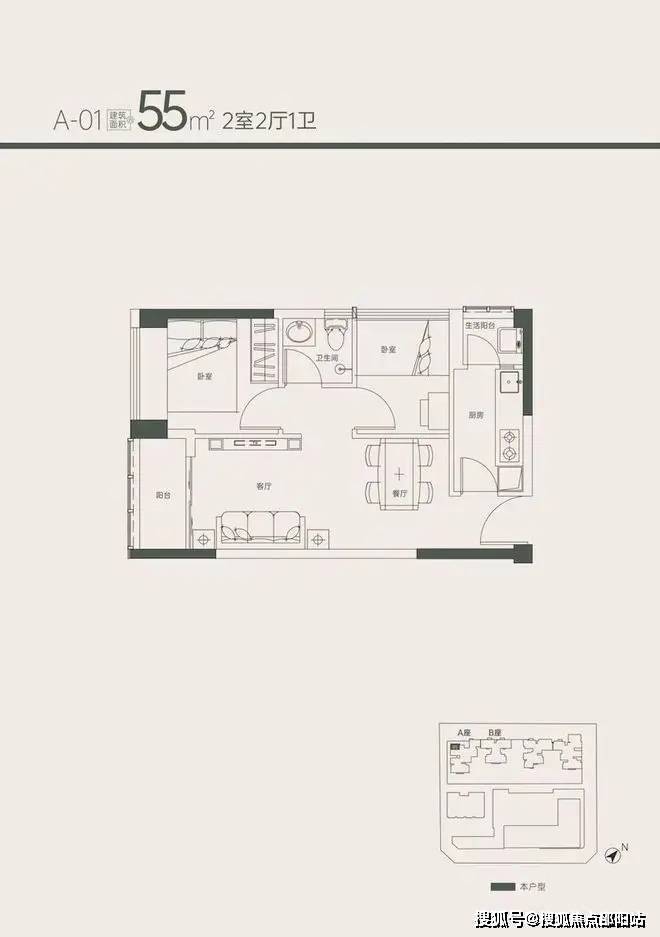 55㎡2房1卫 单价6.7-7.3万/㎡ 总价366-401万145套