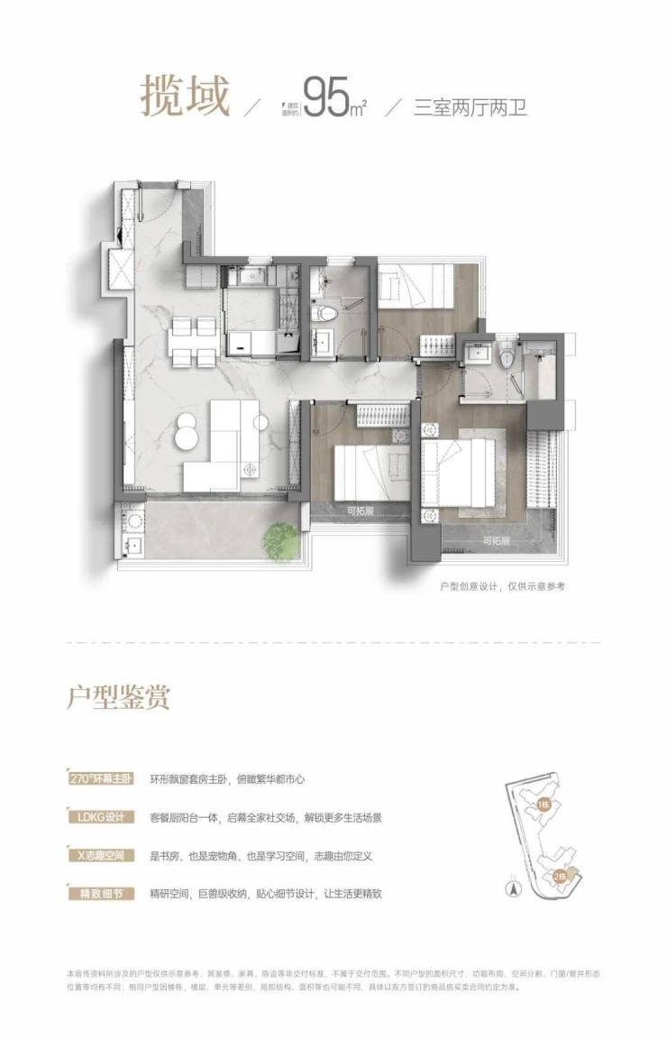 相较于86方的西北向,95方东南向不靠近路边,朝向更好的同时也很大程度避免了噪音影响。
