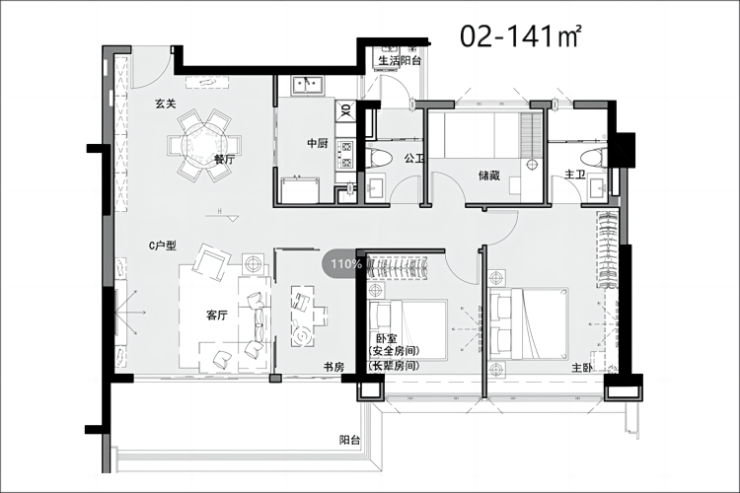 • 6.7米景观阳台,主卧270°飘窗,空间利用率高,适合三代同堂。