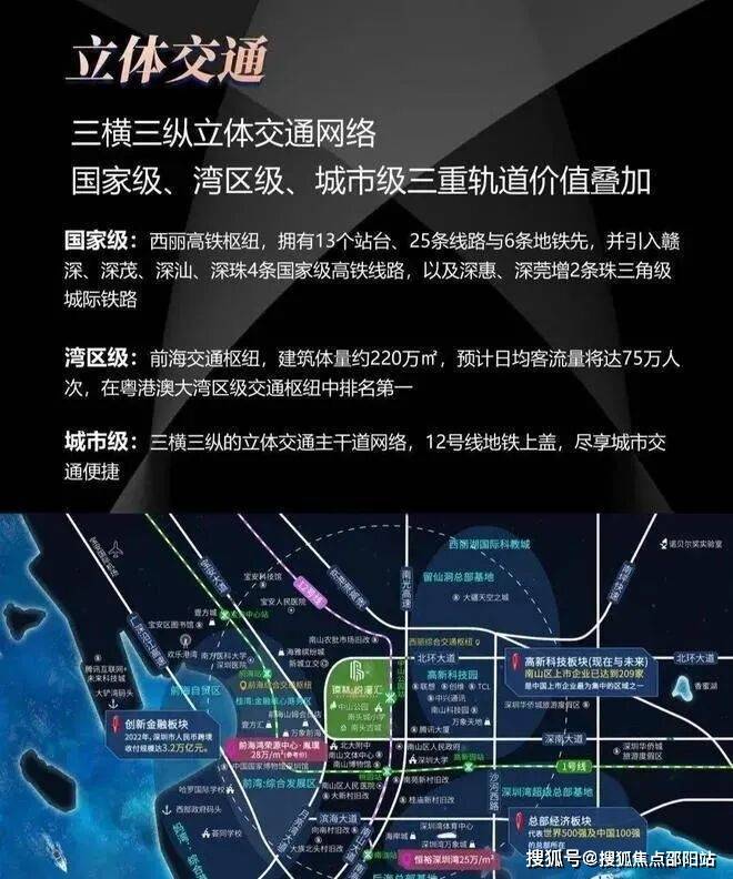 经深南大道、月亮湾大道、北环大道新城立交,直通前海。前海交通枢纽,海、陆、空、轨四维立体交通,畅达粤港澳大湾区各大城市。