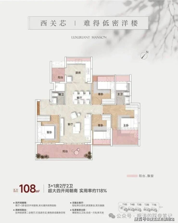 整个项目有5栋10层南向板楼,三个户型分别是98平、108平和156平,全四房设计。