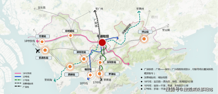 南部的平湖枢纽,将建造一个叫板深圳北站的高铁枢纽, 规划“一枢纽、两城际、3地铁、四快速路”的综合交通枢纽体系,将打造成深圳北部现代化的“枢纽之城”。