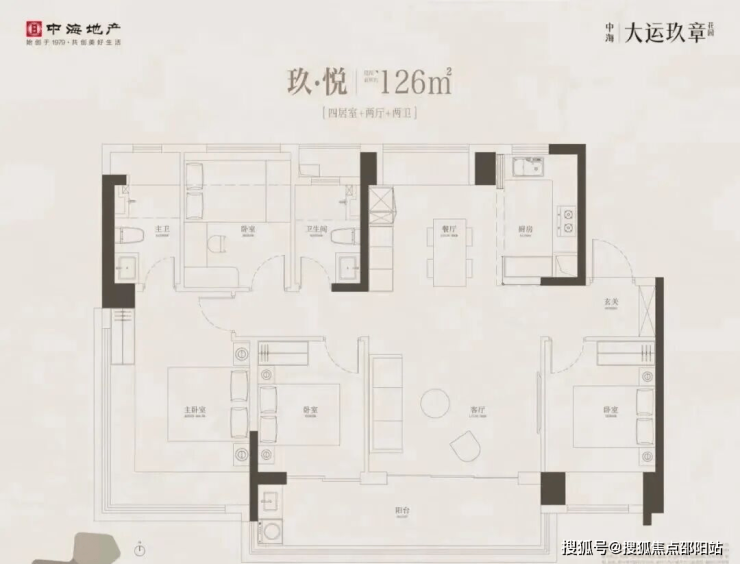126m²的4房2厅2卫,设计的是竖厅南北通透格局,进门入户玄关,客厅4.3米开间,餐客厅分离设计,四开间朝南,全屋八面飘窗,主卧做到了270度转角无柱飘窗,U型厨房,卫生间干湿分离,得房率约95.2%(包含赠送),客厅连接次卧出7.1米长的观景大阳台,全部主朝西南向,看大运公园景观。