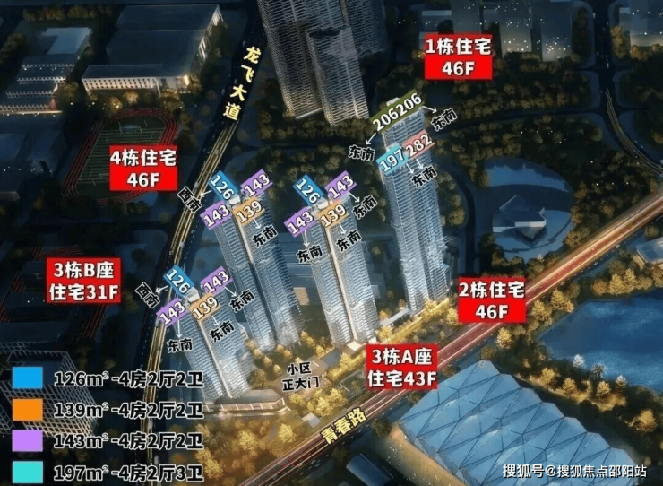 197-206m²的4房2厅3卫2阳台,设计的是竖厅格局,客厅6.1米开间,LDKB大方厅设计,2梯2户,尊享专梯专户,私享入户公区,进门配置储物间,五开间朝南,主卧270°无柱转角飘窗,双套房设计,中西双厨房,主卫配置浴缸,得房率约94.6%(包含赠送),不含电梯入户,南北双阳台,小阳台看大运公园山景,客厅连接2个次卧出超大观景大阳台,东南朝向,俯瞰整个大运中心。