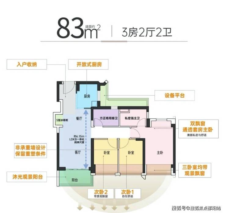 80平米三房两卫(南北通):设计的是竖厅南北通透格局,客厅3.2米开间,全屋9个飘窗面,3个卧室分别做到了主卧18.38㎡/次卧7.32㎡/次卧7.16㎡(包含墙体飘窗),得房率约:104%(包含赠送),阳台主朝西北或东北向。
