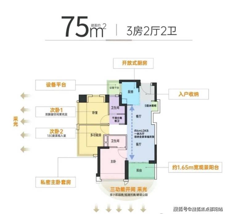 75平米三房两卫:设计的是竖厅格局,客厅3.1米开间,3个卧室分别做到了主卧9.52㎡/次卧9.47㎡/次卧8.82㎡(包含墙体飘窗),公卫带2㎡的设备平台,得房率约:95%(包含赠送),西南或东北朝向。