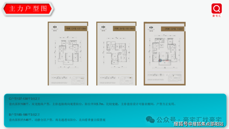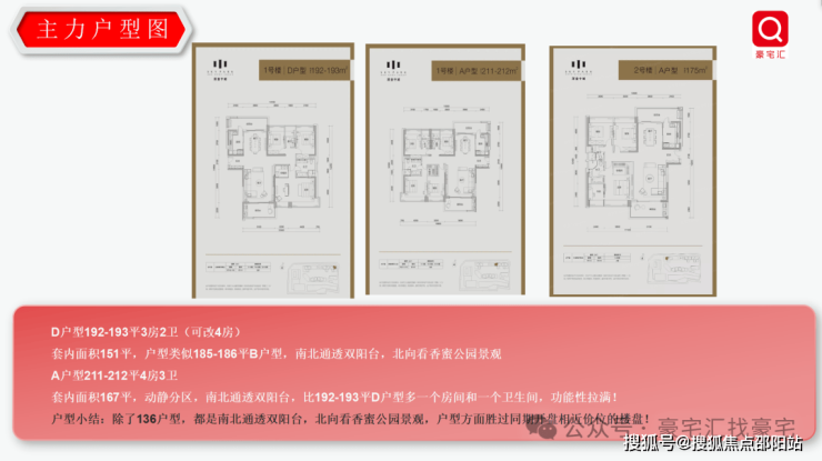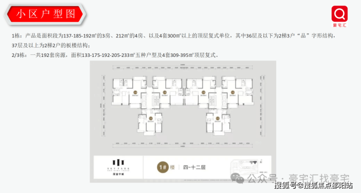 1栋:212㎡的4房、137㎡、185㎡、192㎡的3房,2/3栋:133-175-192-205-233㎡五种户型及4套309-395㎡顶层复式