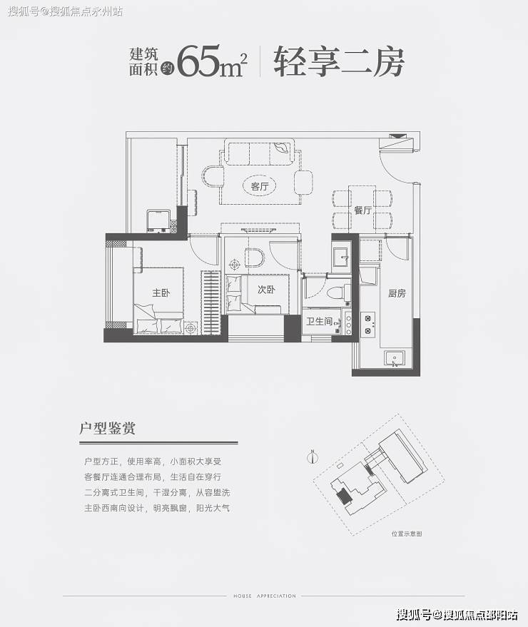 65㎡两房一卫:竖厅格局,餐客厅一体化,L型厨房,卫生间三段式分离;主卧及阳台西南朝向,得房率75.2%。