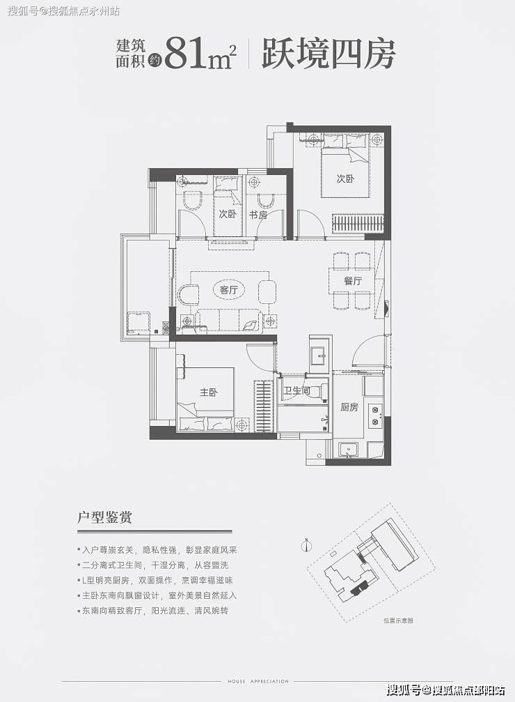 81㎡四房一卫:双龙抱珠格局,三开间朝南,动静分区;最小房间可改书房或储物间,东南朝向阳台,得房率75.19%。