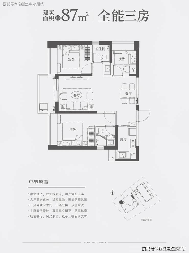87㎡三房两卫:双龙抱珠格局,主卧套房设计(含独立卫浴),三开间朝南,西南朝向阳台,得房率75.2%。