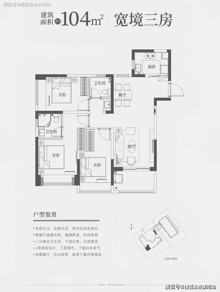 104㎡三房两卫:竖厅南北通透,U型厨房(操作台面4.5米),主卧带270°飘窗,东南朝向阳台,得房率75.19%。