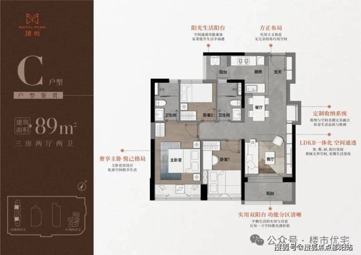 89㎡三房二卫A/B户型,位于1栋一单元,两开间阳台,主卧都有双面凸窗赠送。
