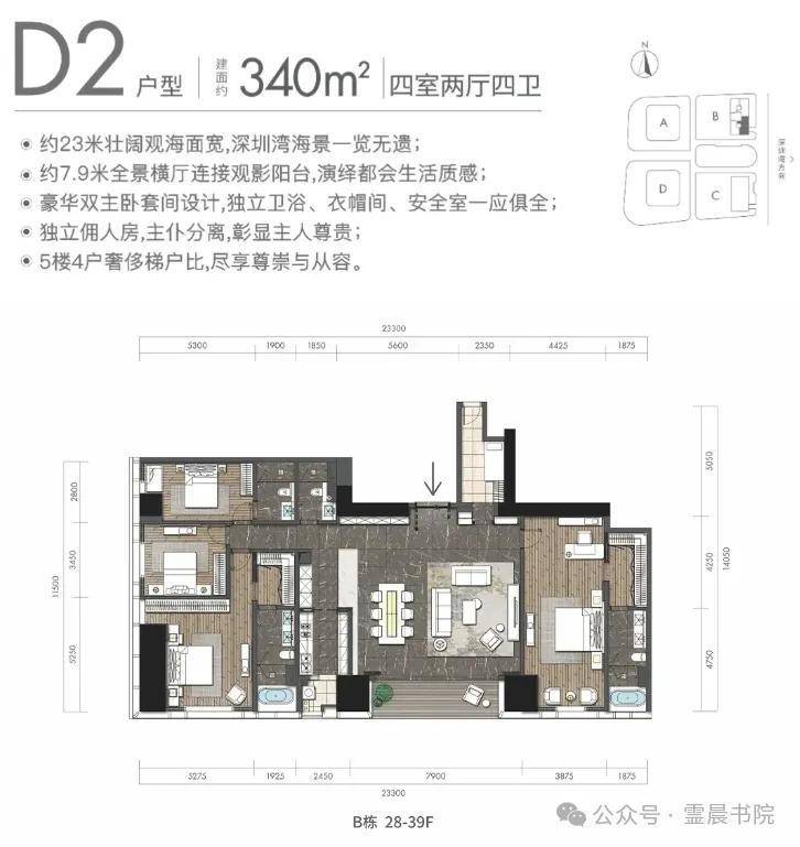 D2户型:约340㎡4房2厅4卫:B栋28-52F(高区),东朝向,户型与343㎡户型基本相同。