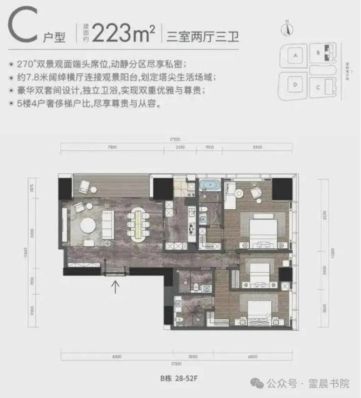 C户型:约223㎡3房2厅3卫:B栋28-52F(高区),东朝向