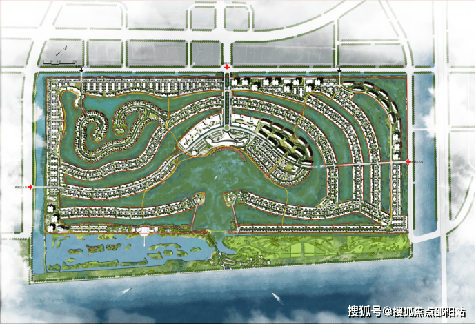 总用地面积233.33公顷,其中建设用地约为133.33公顷(合2000亩),约1500亩的带状肌理的湿地,如此自然天成的地理条件,设计师以华夏文化、水韵绿洲为资源本底,打造集旅游休闲度假、文化主题体验、滨海康养旅居为一体的顶级水岸诗意社区。场地规划一心一轴七组团,产品类型的多样,别墅面积段以105㎡、130㎡、170㎡、260㎡为主,沿地形带状布置,于景观开阔处搭配小面积段的公寓式住宅,将自然景观最大化的引入户内,场地中心设五星级酒店及商业街,为整个文旅项目提供完备的配套设施。