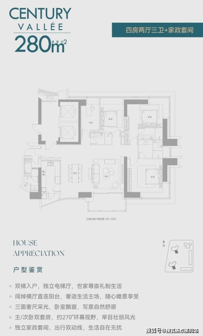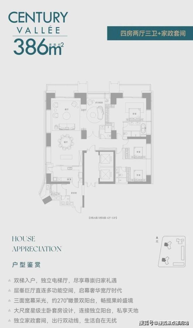 约386㎡的4房3卫,双梯入户,独立电梯厅,阔绰横厅直连多功能空间,三面舒适采光,主次卧双套房,270°环幕视野,还有独立家政套间,西朝向看名商高尔夫和大河沙生态长廊。