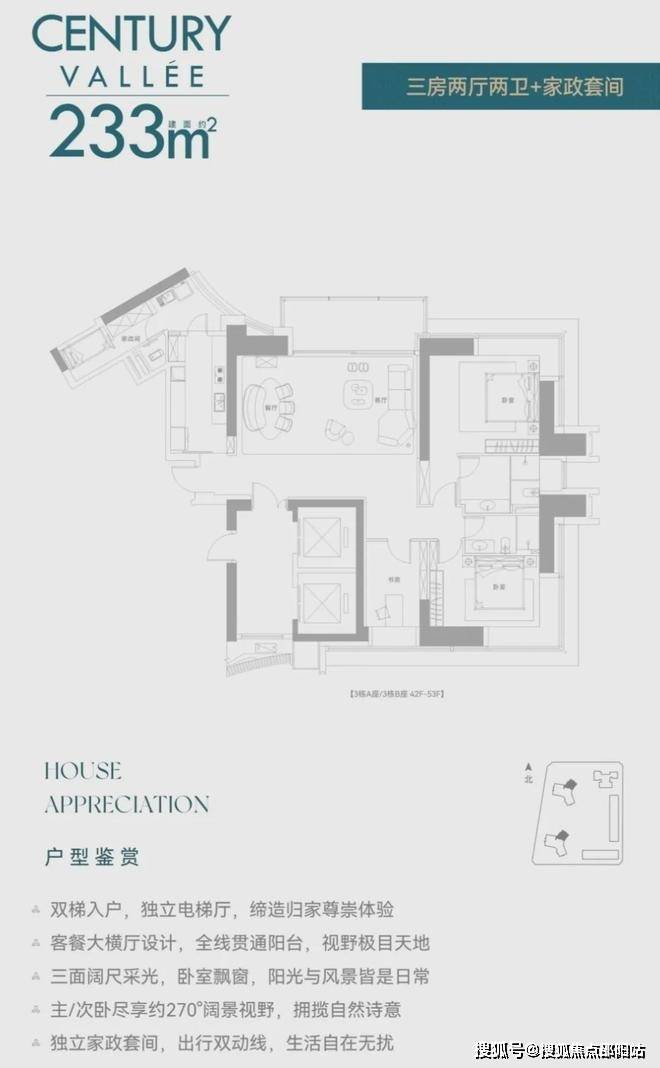 约233㎡的3房2卫,双梯入户,独立电梯厅,餐客大横厅贯通阳台,三面采光,主次卧尽享270°环幕视野,还有独立家政套间,西北朝向看名商和沙河高尔夫;