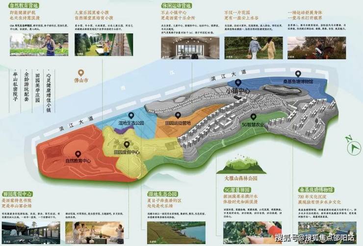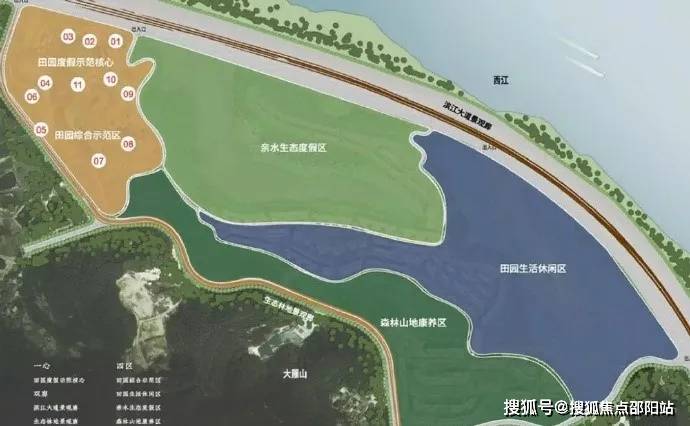 项目分为四个区域:田园综合示范区、亲水生态度假区、田园生活休闲区、森林山地康养区。