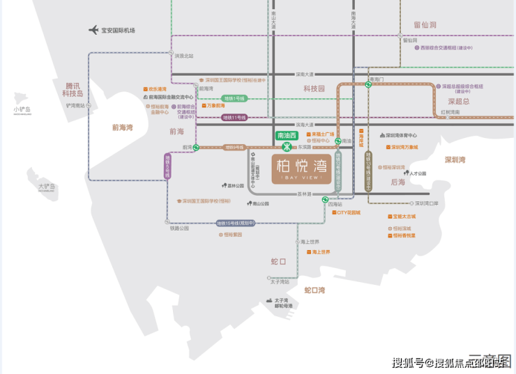 【南油西站地铁上盖——六维立体交通】·轨道交通:地铁9号线南油西站上盖,1/2/5/11/12号线南山站,13/15号线(建设中)四海站环伺。