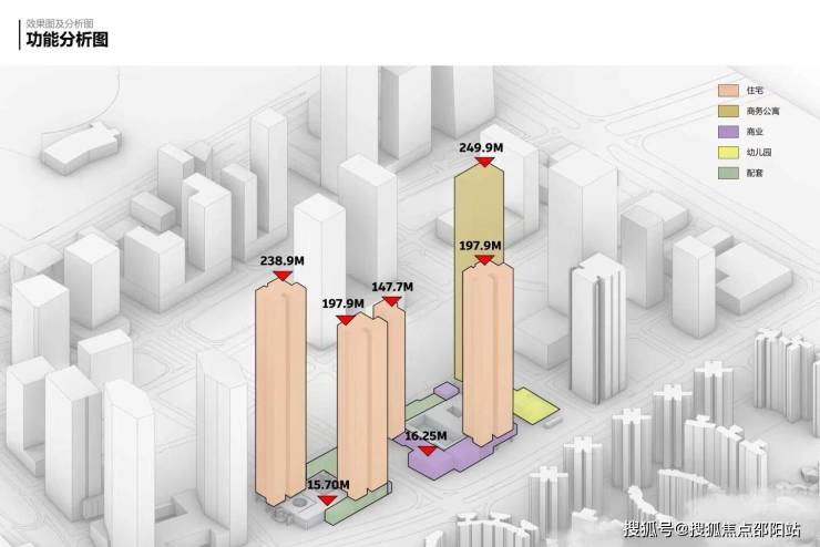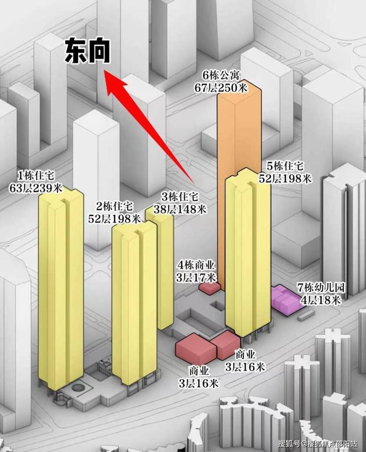 从建筑布局来看,小区采用 “1+4” 的塔楼规划结构:1 栋为高度 250 米的商务公寓,据目前信息显示,该公寓预计将以整售形式推出,不单独面向个人购房者销售;另外 4 栋为住宅塔楼,高度分别约为 150 米、200 米、200 米与 240 米,高低错落的建筑排布既能减少视野遮挡,也让社区天际线更具层次感。