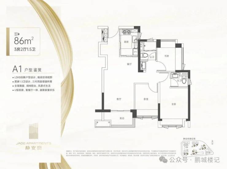 - 80-86㎡三房1.5卫:采用竖厅设计,S型墙体预留冰箱位,1.5卫设计(主卧0.5卫)提升实用性,得房率高达85%-90%。