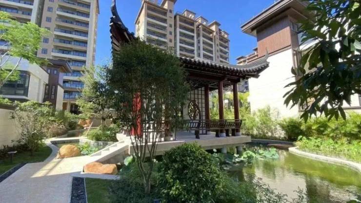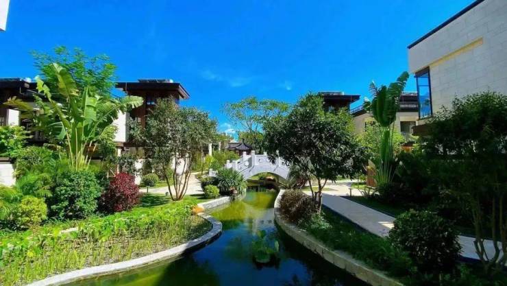 中央水系景观以逐浪庭,渠水庭,银锭桥,浮云庭,月亮门,结合三亚丰富的热带植被花卉进行绿化铺陈,打造中正大气、绿意盎然、小桥流水、生机勃勃动静结合的项目建筑景观全系风貌。