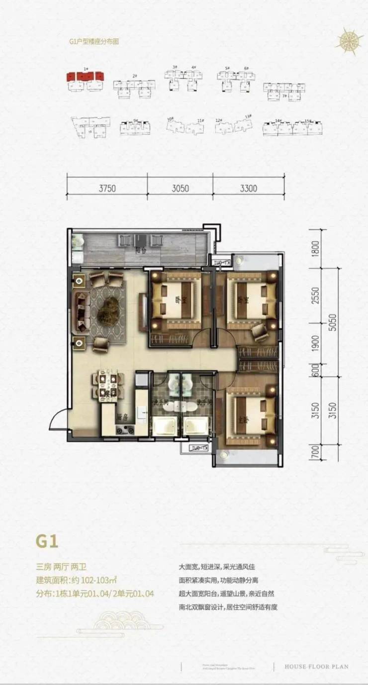 一单元两梯4户,二单元2梯3户,13层高,三房两厅两卫,超大2.4-2.75m阳台开间,双户型全朝南设计。