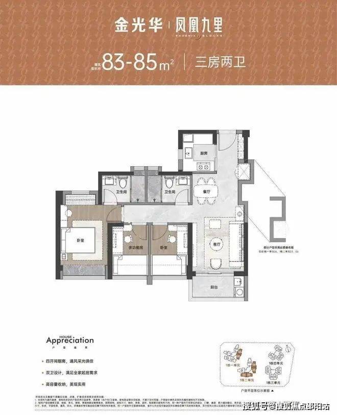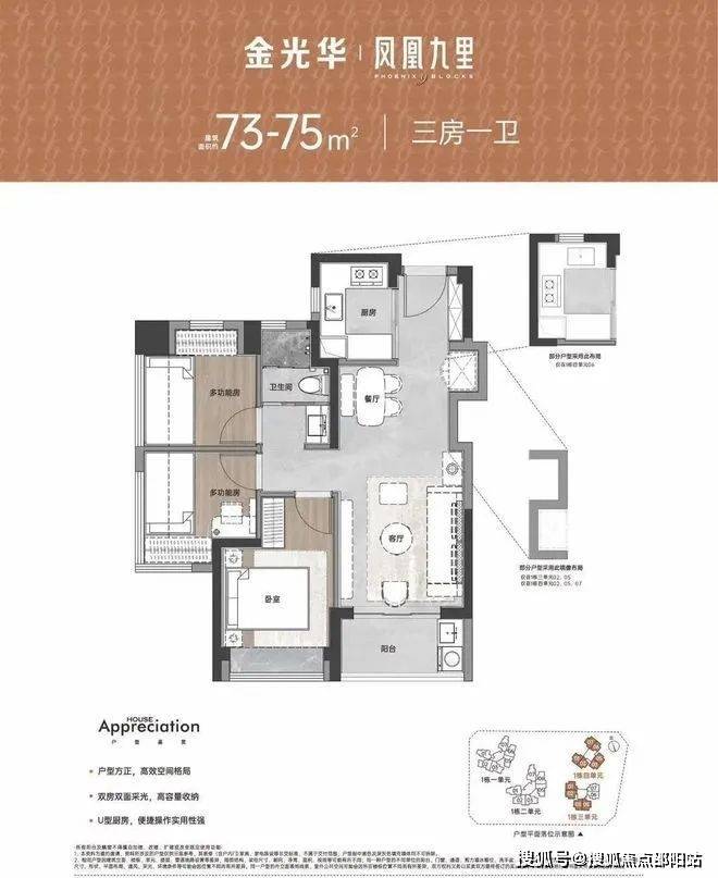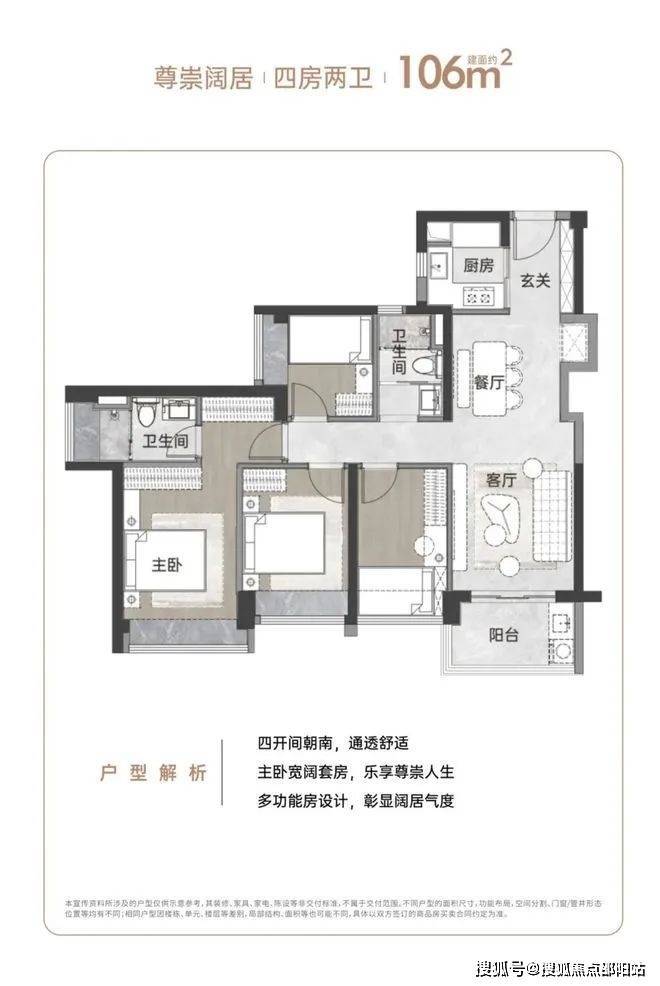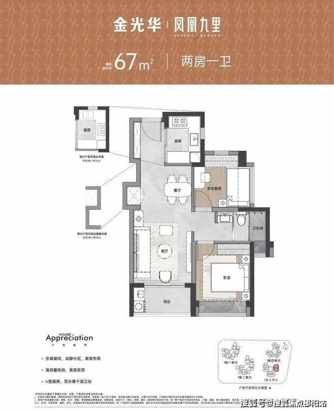 设计的是竖厅格局,S墙设计预留冰箱位,四开间朝南,主卧双窗户南北对流,U型厨房,有西南朝向及东南朝向以市面上三房一卫的面积,获得三房两卫的进阶体验,成为项目明星网红户型,是对生活品质有更高追求的改善型家庭的置业首选。