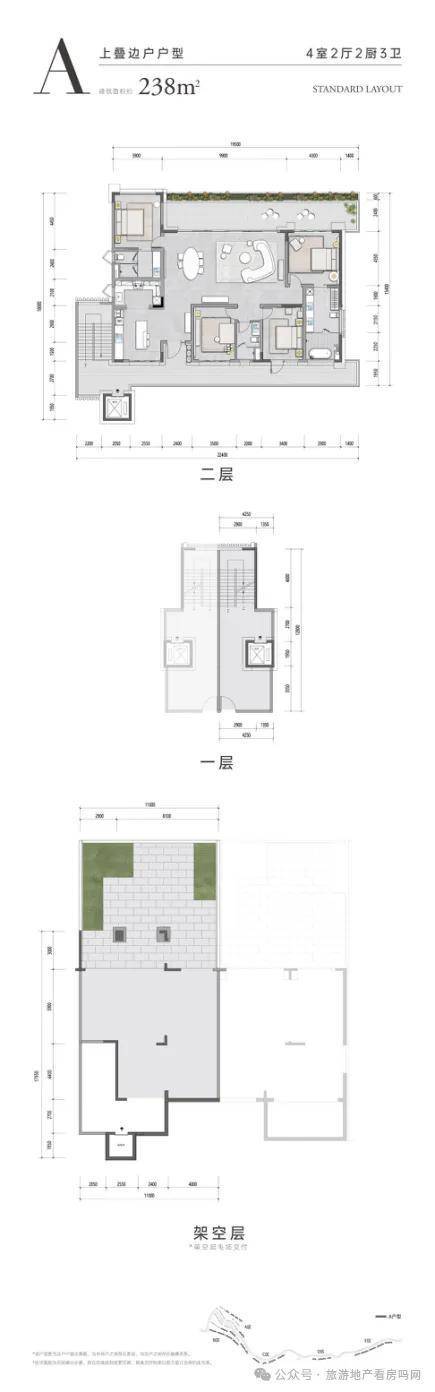 果岭叠院:A上叠边户户型,建筑面积约238㎡,4室2厅2厨3卫。该户型上下两层,方正敞阔;豪华主卧套房,带衣帽间,生活私密性强;客餐厅一体,布局开阔,连通超长景观阳台。