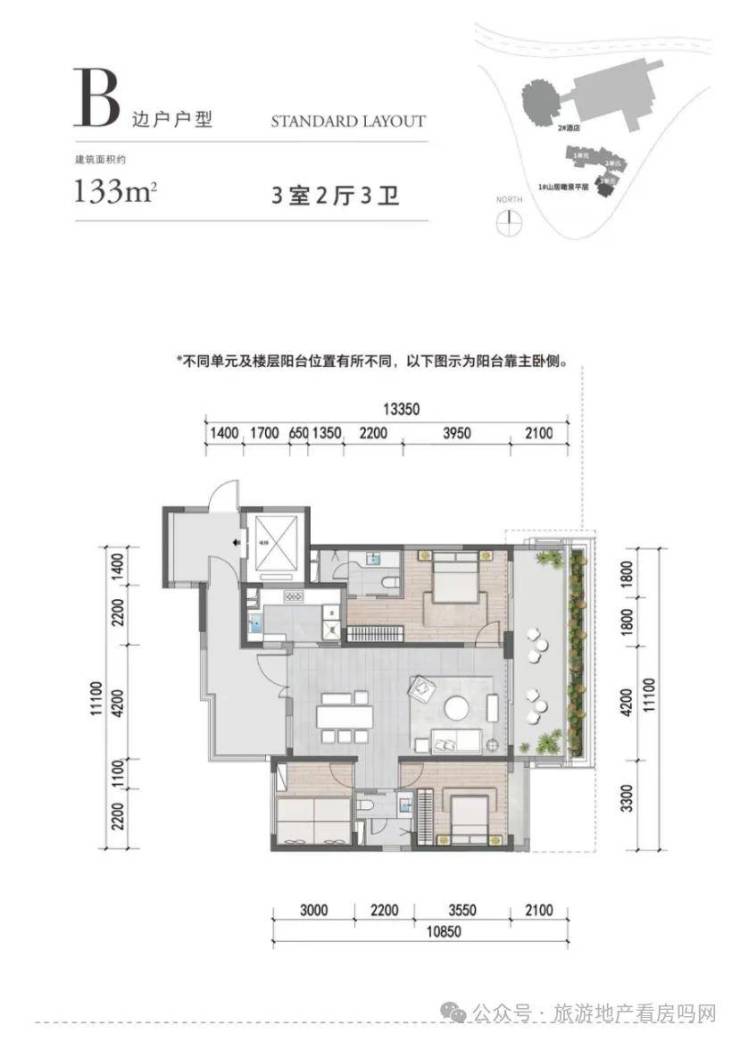 伴山低密洋房:B中间户户型,建筑面积约135㎡,3室2厅3卫。该户型方正通透,前后充足采光;餐客一体贯通,连接宽境阳台,满足家庭多样化需求,一席多功能空间,延伸家的更多可能。