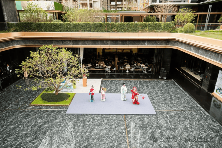 复古的中式庭院,配以波光水景、八块石板组成的归家轴线,上聚四方雨水、下集四水归堂,寓意四平八稳、八方来财