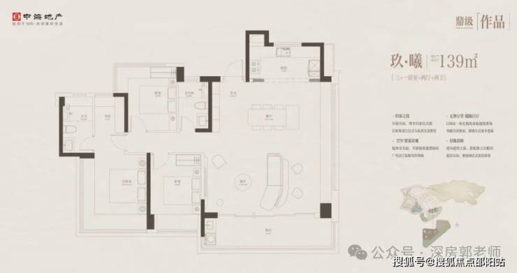 139㎡拥有超大双面采光大方厅,可享西南向山景和东南向大运中心双面景观,户型算是3+1房,可以改造为4房,喜欢全通透大客厅的可选。
