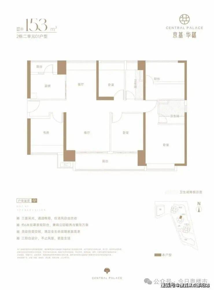仅2栋2单元05户型才有,设计的是经典竖厅格局,LDKB一体化,动静分区,四开间朝南,U型厨房,卫生间干湿分离,得房率约73%(不含赠送),阳台西南朝向。
