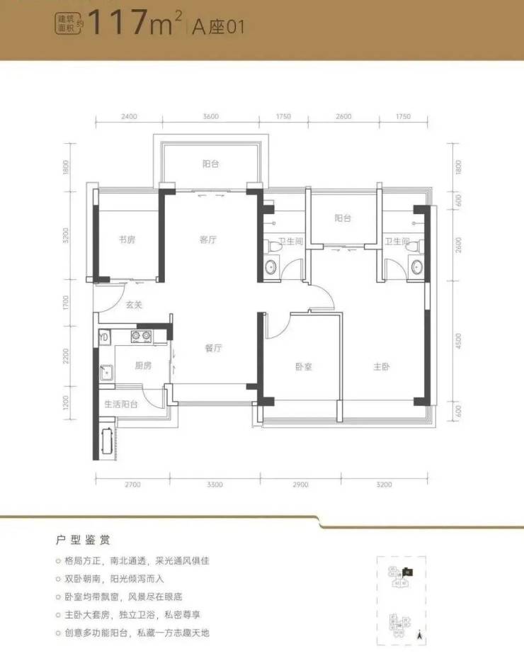 格局方正,南北通透,采光通风俱佳,双卧朝南,阳光倾泻而入,卧室均带飘窗,风景尽在眼底,主卧大套房,独立卫浴,私密尊享,创意多功能阳台,私藏一方志趣天地。