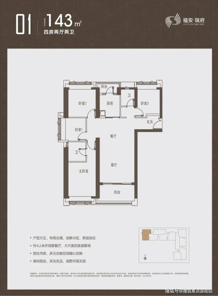 户型图如下,主推建面约97-98-112-126-143㎡的3-4房产品,户型均设计有双阳台、双套房。