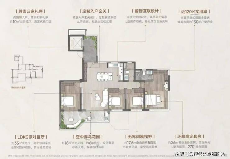 而「岛颂」以市场首现的约120%实用率(不含电梯前室),让约117㎡实际使用面积直逼约150㎡——相当于“白送”约33㎡。