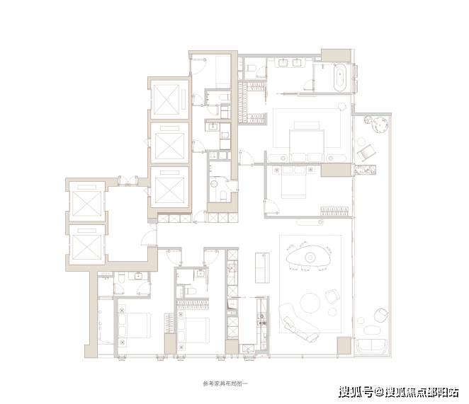 奢丨双套房奢阔合理。主卧-朝东侧海景布置,大面宽落地门窗连接景观阳台,阔绰酒店式套房设计,形成完整私域空间。次卧-尺度合理,灵活布置,与主卧互不干扰。